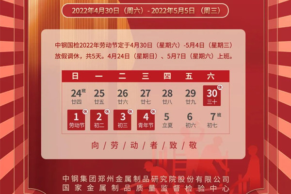 不停工 | 中鋼國檢2022年五一勞動節假期安排